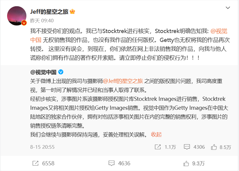 視覺中國曾經(jīng)因“黑洞照片”而陷入輿論漩渦,引發(fā)多發(fā)爭議,而今年的8月15日,星空攝影師戴建峰稱自己拍的照片被“視覺中國”告侵權并要求賠償8萬元。