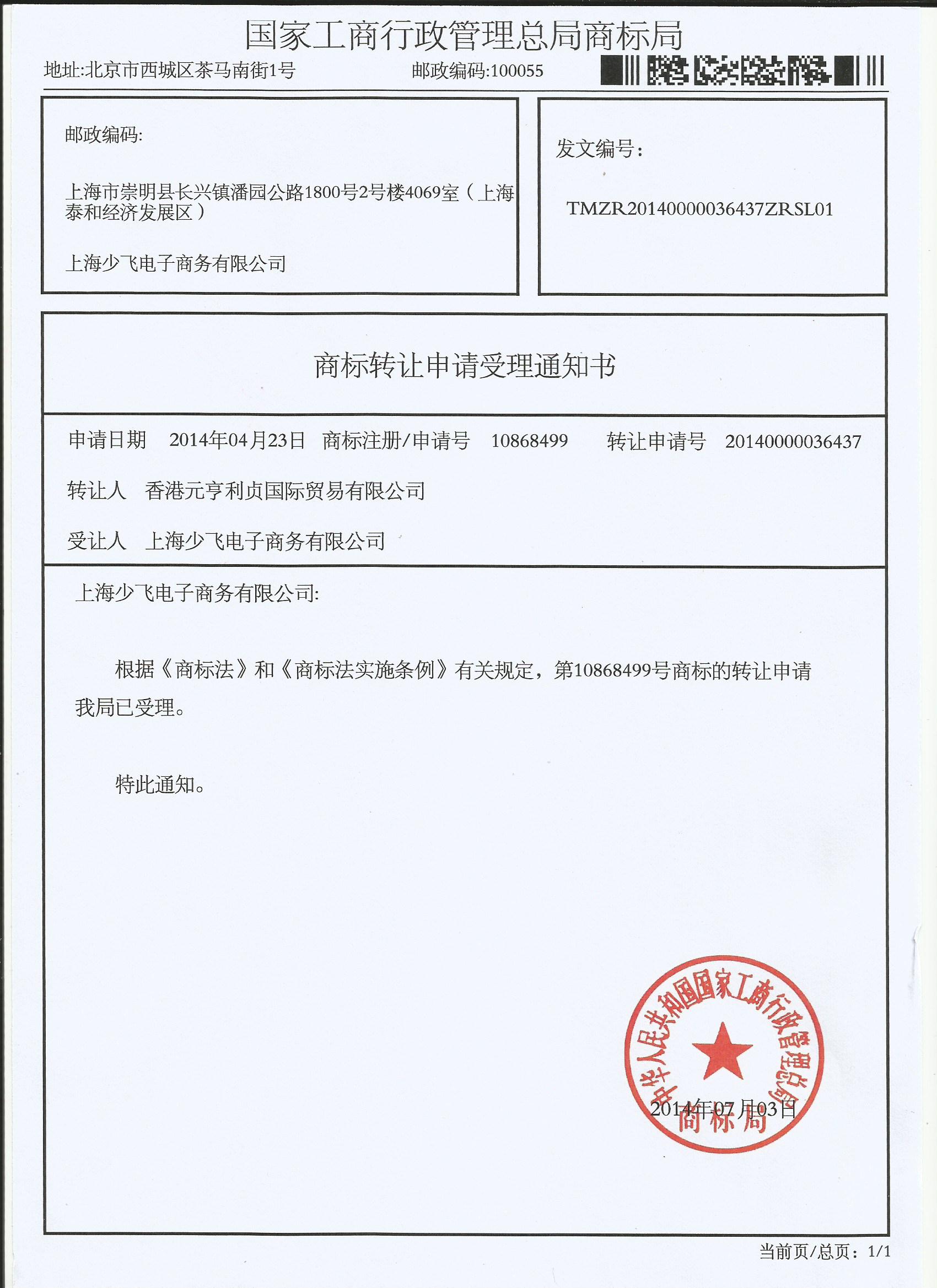 4、 郵寄資料,上報過戶:買方收到我司寄出的《商標證》、《公證書》和《獨占使用授權書》后即可使用;并在《轉讓/移轉申請/注冊商標申請書》等相關資料后需簽字或蓋章回寄到我公司提交國家商標局辦理商標過戶手續(xù)。