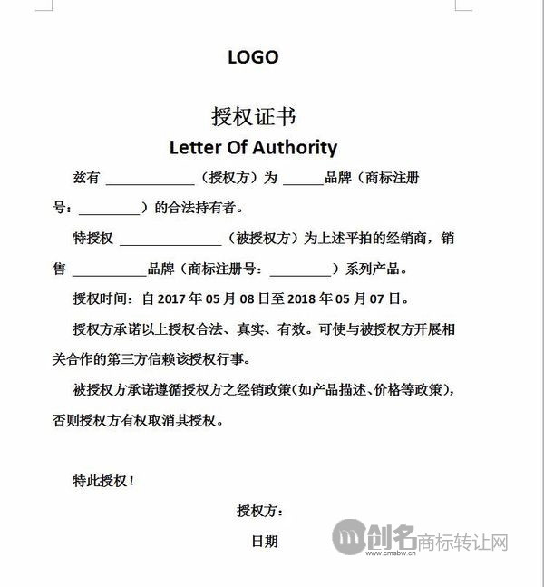 商標(biāo)授權(quán)是指商標(biāo)注冊(cè)人通過(guò)簽訂商標(biāo)使用授權(quán)合同授權(quán)他人使用其注冊(cè)的商標(biāo),被授權(quán)人可以通過(guò)授權(quán)合同從事經(jīng)營(yíng)生產(chǎn)活動(dòng),那么商標(biāo)授權(quán)書該如何寫?是否有規(guī)范的格式?創(chuàng)名商標(biāo)網(wǎng)會(huì)為您作詳細(xì)的解答: