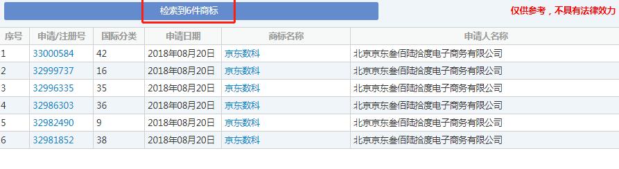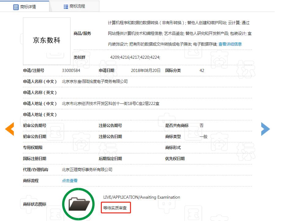 巨頭們的風(fēng)向變得快,投資人的下手速度也不是蓋的。在國(guó)家商標(biāo)局查到的商標(biāo),在2018年8月29日京東提交申請(qǐng)了6枚“京東數(shù)科”商標(biāo)注冊(cè)申請(qǐng),涵蓋第9類、16類、35類、36類、38類和42類,目前都處在等待實(shí)質(zhì)審查階段。