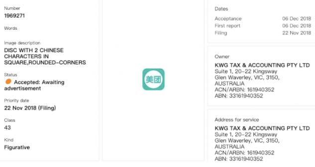 澳大利亞知識(shí)產(chǎn)權(quán)局官網(wǎng)上,“美團(tuán)”商標(biāo)注冊(cè)類(lèi)型為“產(chǎn)品及服務(wù)”的第43類(lèi)別,包含餐廳預(yù)訂、住宿預(yù)訂等18個(gè)大項(xiàng),注冊(cè)人為KWG TAX ACCOUNTING PTY LTD。