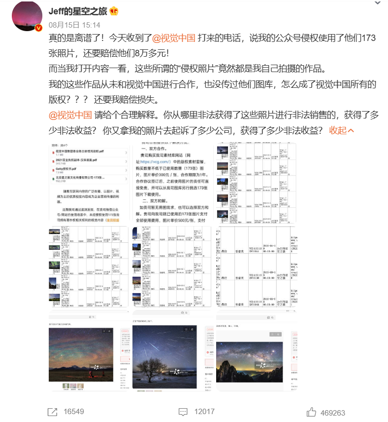 視覺中國曾經(jīng)因“黑洞照片”而陷入輿論漩渦,引發(fā)多發(fā)爭議,而今年的8月15日,星空攝影師戴建峰稱自己拍的照片被“視覺中國”告侵權并要求賠償8萬元。