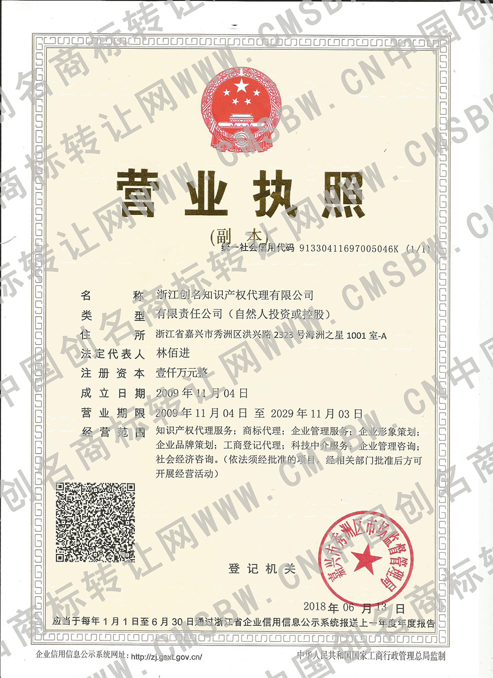 浙江創(chuàng)名知識代理有限公司是一家專業(yè)從事商標(biāo)、專利、版權(quán)等綜合性知識產(chǎn)權(quán)服務(wù)平臺,是國家工商行政管理總局商標(biāo)局備案機(jī)構(gòu),主要包括商標(biāo)轉(zhuǎn)讓、商標(biāo)注冊、專利轉(zhuǎn)讓、版權(quán)登記等知識產(chǎn)權(quán)的申請、轉(zhuǎn)讓、維權(quán)服務(wù);在國家大力倡導(dǎo)知識產(chǎn)權(quán)重要性的背景下,我司通過網(wǎng)絡(luò)技術(shù)為全國各地企業(yè)提供全面的知識產(chǎn)權(quán)服務(wù),公司始終奉行“客戶第一、服務(wù)至上”的經(jīng)營理念,堅持“專業(yè)、誠信、優(yōu)質(zhì)、高效”服務(wù)宗旨,深受廣大客戶的好評,為建成中國特色、世界水平的知識產(chǎn)權(quán)強(qiáng)國做出我們應(yīng)有的貢獻(xiàn)。